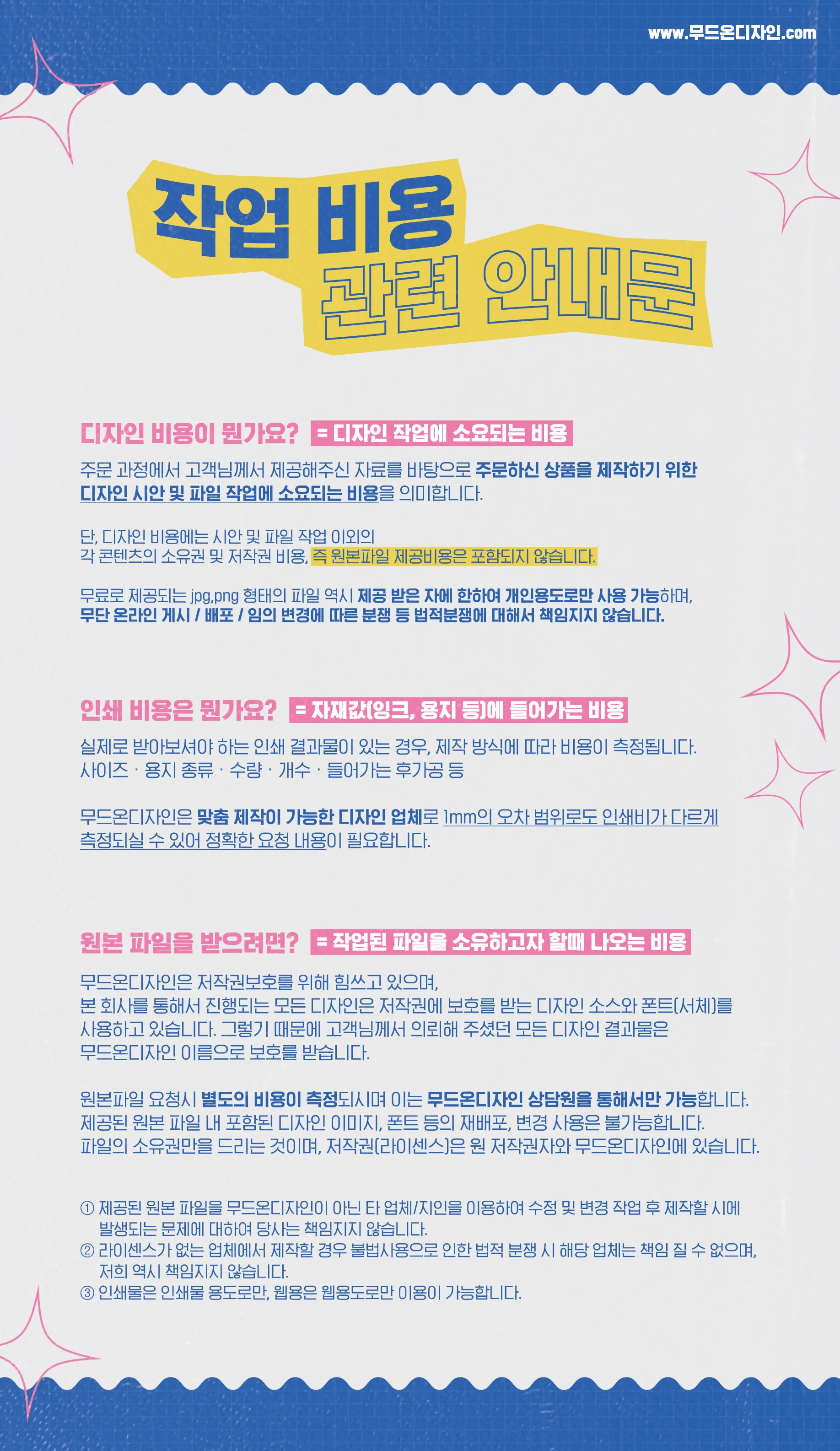 · 디자인 작업 비용 · 인쇄비용 · 원본데이터비용 · 배송비 · 부가세 별도